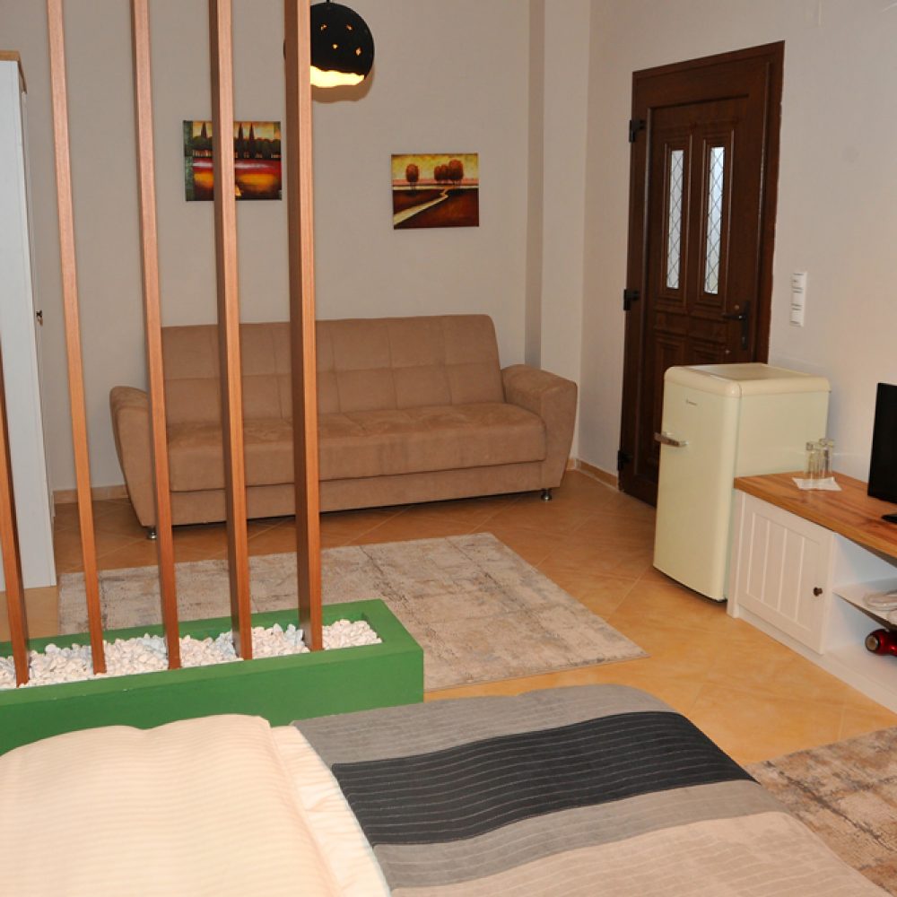 Η πανοραμική θέα αυτού του δωματίου σε συνδυασμό με όλες τις σύγχρονες ανέσεις που περιλαμβάνει το κάνει ονειρικό. Συνολικά στη μονάδα μας διαθέτουμε 2 αυτού του τύπου, τα οποία επιλέγονται συχνότερα για την πρώτη νύχτα των νεόνυμφων ζευγαριών.